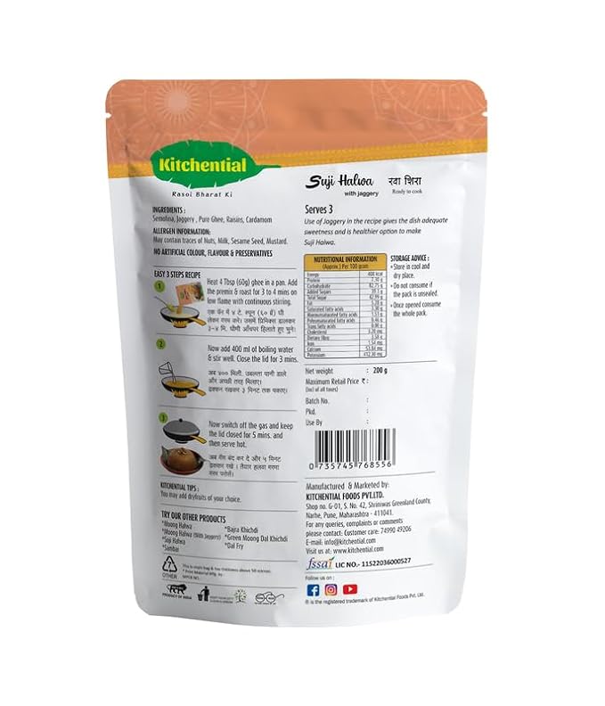 Experience the perfect balance of nutrition and indulgence with Kitchential’s Bajra Khichdi & Suji Halwa with Jaggery Combo. This thoughtfully paired pack combines the hearty wholesomeness of bajra khichdi with the comforting sweetness of suji halwa. Ready in minutes, it’s a complete meal that gives you both health and satisfaction without compromising on authentic taste.