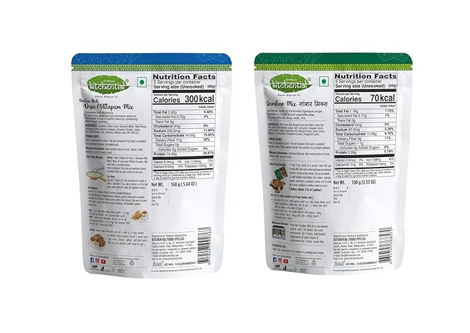 Enjoy the perfect South Indian meal with Kitchential’s Dosa/Uttapam + Sambar Combo Mix. This thoughtfully crafted combo brings together soft, protein-rich dosas or uttapams paired with flavorful, aromatic sambar-giving you a complete, wholesome meal at home in minutes. No long preparations, no hassle-just authentic taste, nutrition, and convenience in one pack.